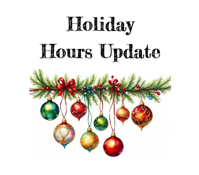As always, we are closed Sundays and Mondays. Thank you so much for your patronage this year and we can't wait to see what 2026 brings!!! Happy Holidays!